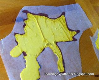 After our long hike, we had a nice lunch and came home to rest. Later we pulled out the wax paper and paint/glue that has been bouncing around the internet. I saw it at Pink and Green Mama.